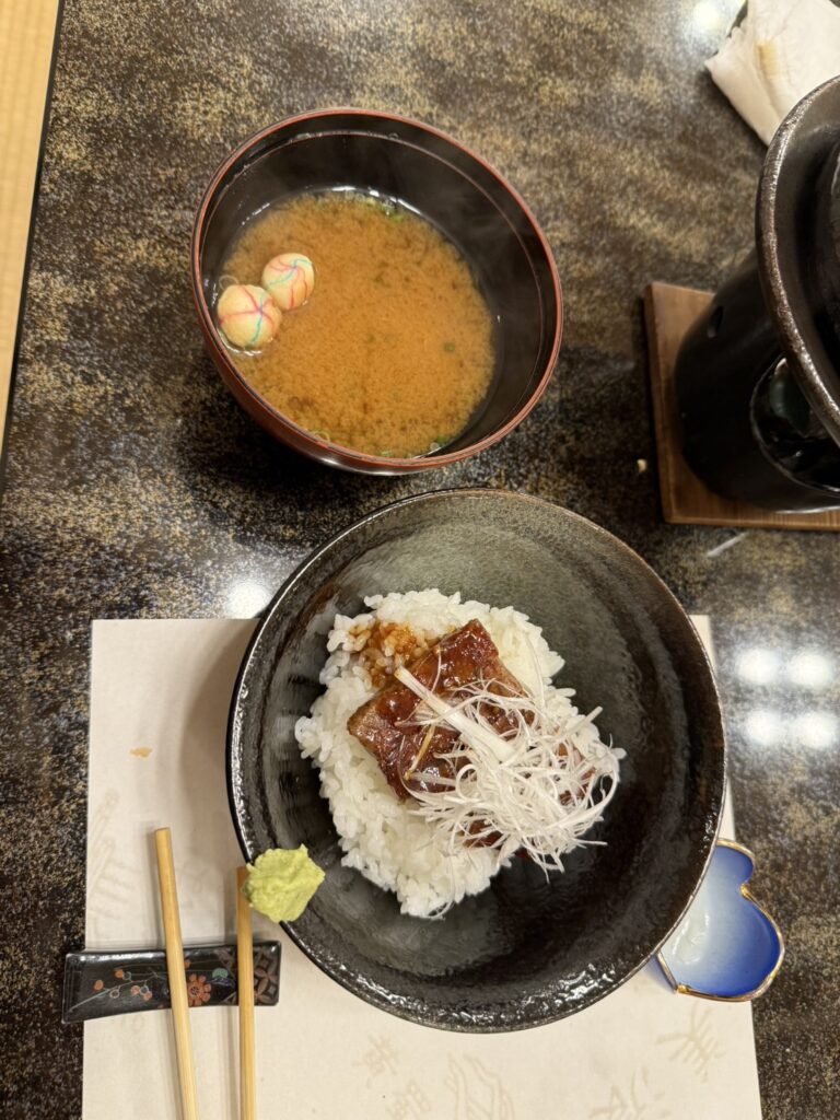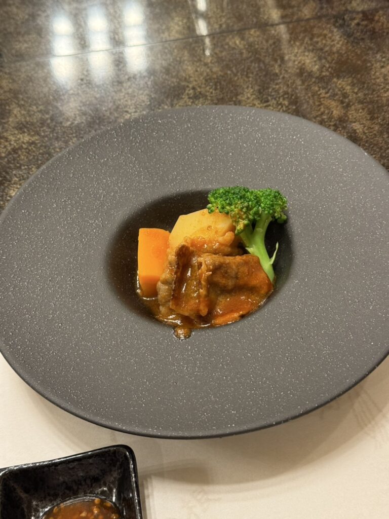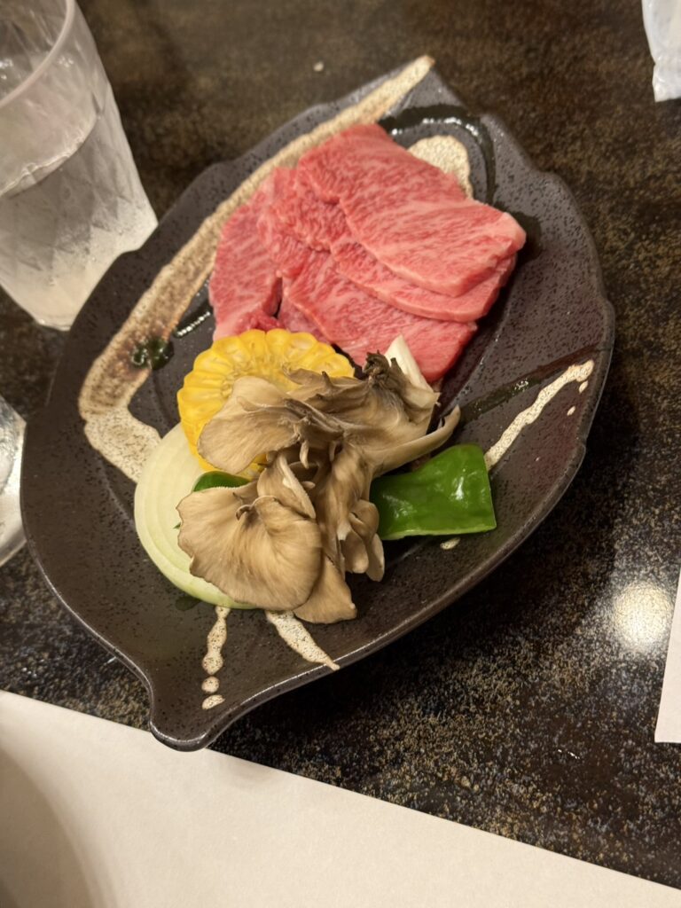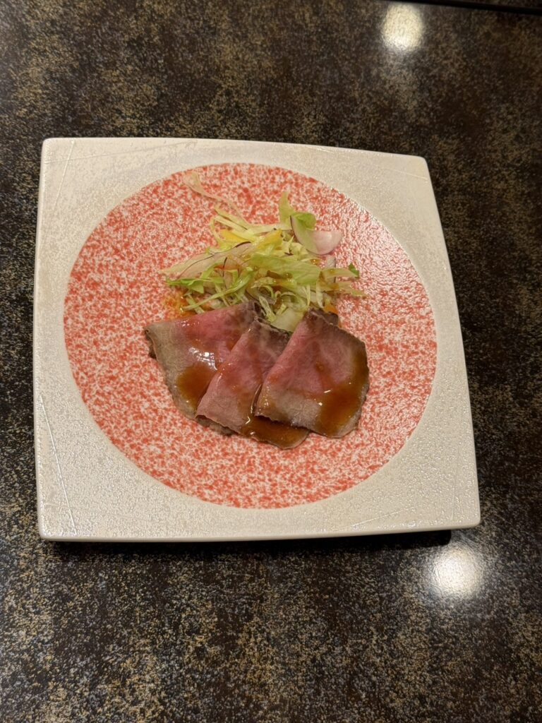 飛騨牛のコース料理にしていました。すき焼き、ローストビーフなど、色んな肉料理のコースでした。脂が甘くておいしくて、最後のステーキ丼までおいしくいただきました。