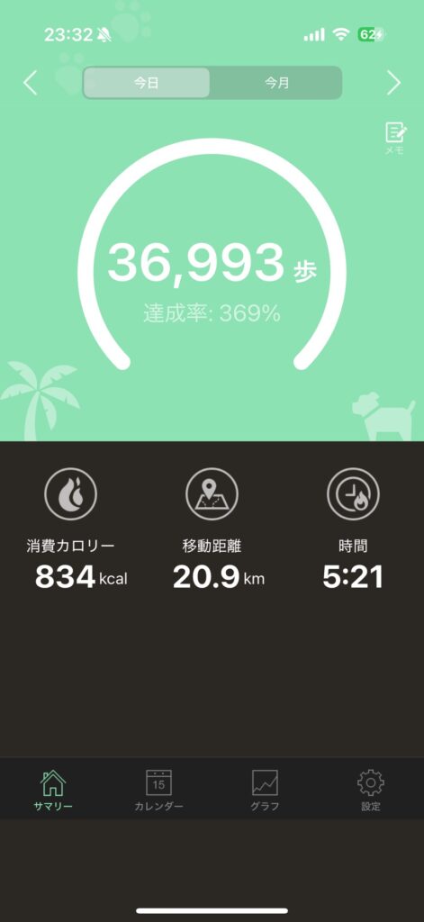 そしてこの日歩いた歩数は・・・36,993歩!!距離にして約21キロ!!恐らく人生史上最高に歩いた日だと思います。階段の上り下りもあったのでへとへとでした。でもなぜか疲れだけでなく充実感や満足感そして期待感など気持ちよく終える事が出来ました。