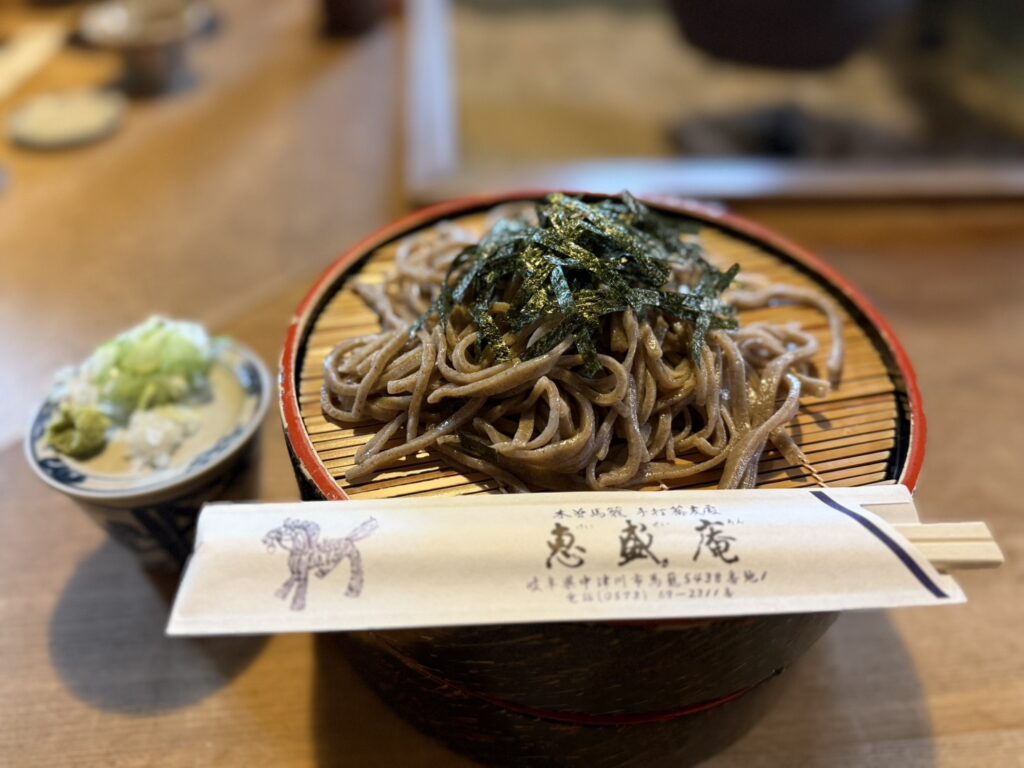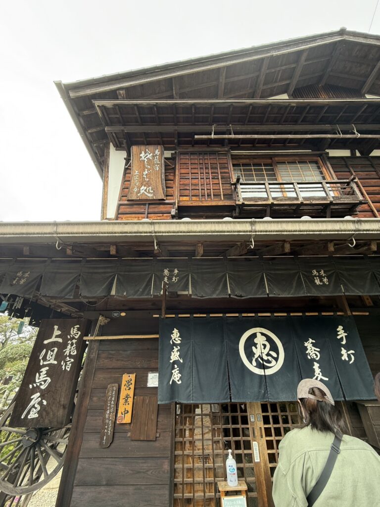 その足で大抵は『くるまや 中津川店』へ向かうのですが、今回はちょっと新たなお店探しと馬籠宿へ行こうと言う事で出発!かなり混んでいましたが、お店を見ながらぶらぶらしていると依然行った事があるそば屋さんがありました。「ここにしよう」と言う事で、少し並びましたが20分くらいで入店でき美味しくいただきました。お店の名前は『恵盛庵(けいせいあん)』です。